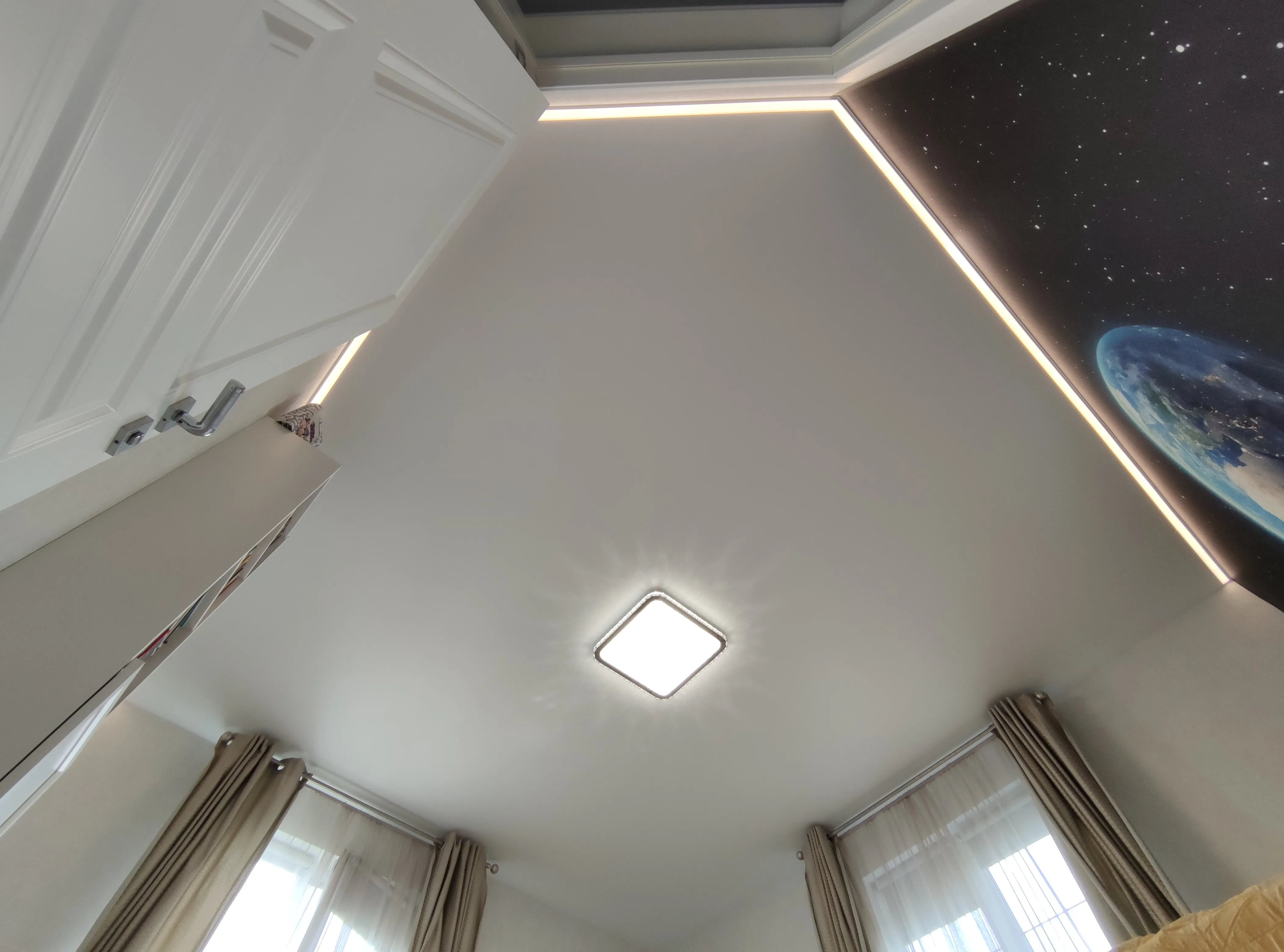 Сама подсветка может быть одноцветной и многоцветной. А натяжное полотно — пленочным или тканевым. ПВХ-пленки и тканевые покрытия по фактуре бывают глянцевыми, сатиновыми и матовыми. Выбор типа фактурной поверхности зависит от размера и стиля дизайна комнаты, личных пожеланий клиента.