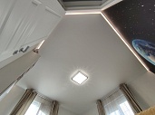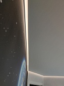- Контурную светодиодную подсветку. Создаёт уютную атмосферу, эффект парения полотна за счёт размещения светодиодной ленты по периметру комнаты.
