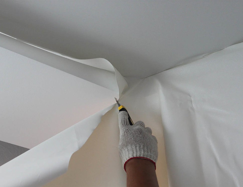 Между стеной и профилем не должно быть зазоров. Поэтому важно очень точно огибать даже криволинейный участки стен. Значит, нужно делать запилы, примерки, снова запилы до идеального примыкания. Затем нужно просчитать изгиб во время натяжки полотна. А при монтаже по гарпунной технологии необходимо специально изготавливать полотно в соответствии с формой потолка.