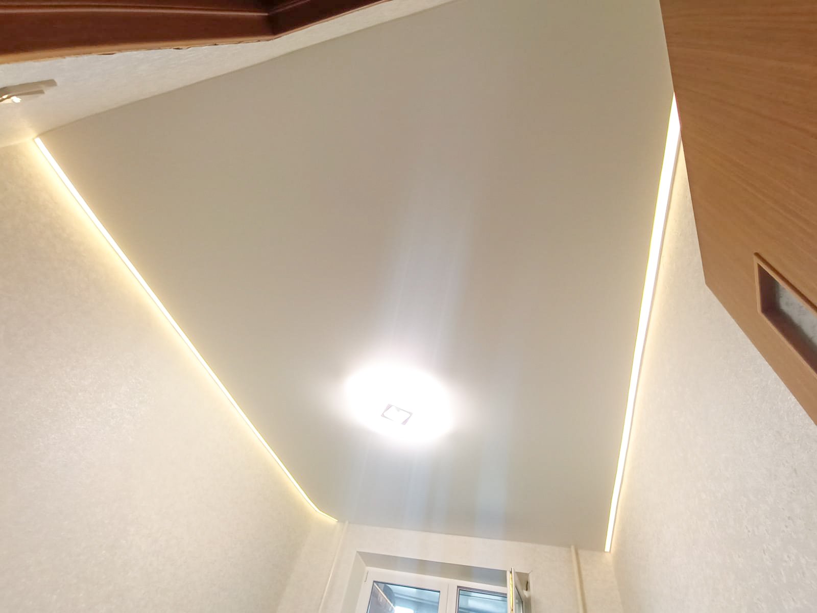 Мой опыт показывает, что на матовой поверхности отлично смотрятся как трековые светильники, так и световые линии. Правильно подобранный свет на таком потолке снижает утомляемость глаз.