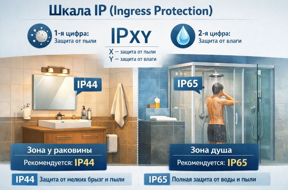 Инфографика классов защиты IP для светильников в ванной комнате.