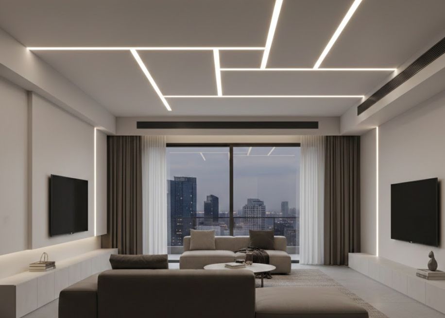 Световые линии — это интегрированные в конструкцию натяжного потолка профили, в которые встраивается светодиодная лента. Они создают геометрические узоры и служат основным или дополнительным источником света, обеспечивая идеально равномерное освещение комнаты без видимых ламп и плафонов. В моей практике такие линейные светильники отлично подходят для минималистичных и хай-тек интерьеров. Один из наших клиентов в Наро-Фоминске отметил, что после монтажа световых линий его гостиная стала выглядеть на порядок дороже и современнее. Скрытые световые панели создают элегантный эффект «парящего света», который является трендом в современном дизайне.