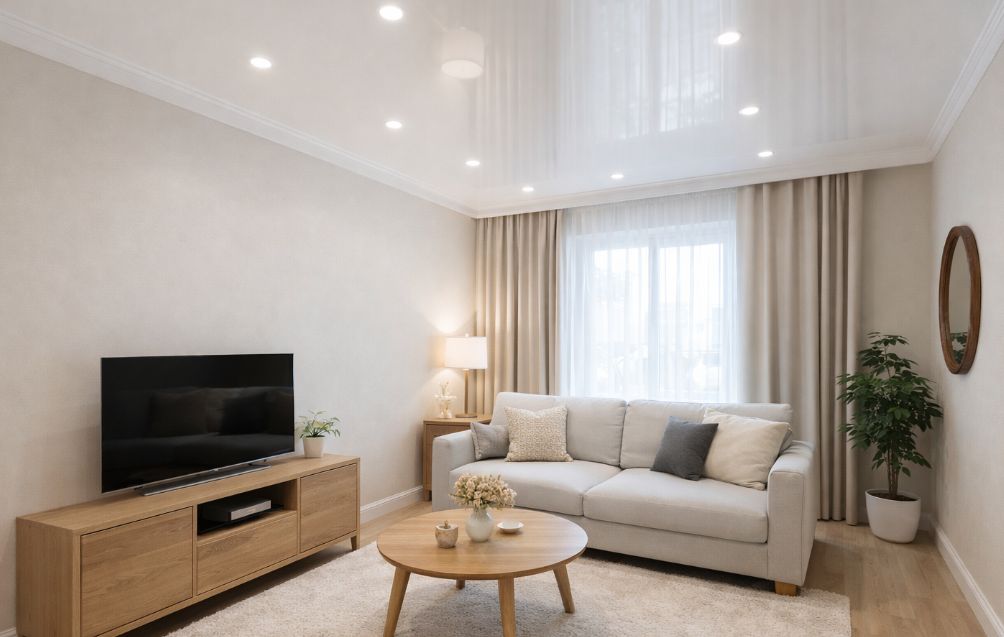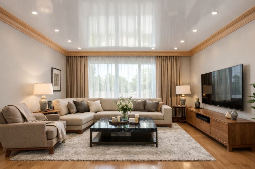 Для натяжного потолка лучше всего подходят лёгкие полимерные профили — дюрополимерный или качественный полиуретановый потолочный плинтус. Такой плинтус клеится только к стене, не контактируя с полотном. Безопасный клей — акриловый или полимерный без растворителей (например, ORAC DecoFix). Подбирайте ширину по высоте помещения: 40–60 мм при 2,5–2,7 м; 20–40 мм в низких комнатах; 70–120 мм — для высоких стен. Из альтернатив — декоративная вставка‑заглушка, теневой профиль (KRAAB, SLOTT).