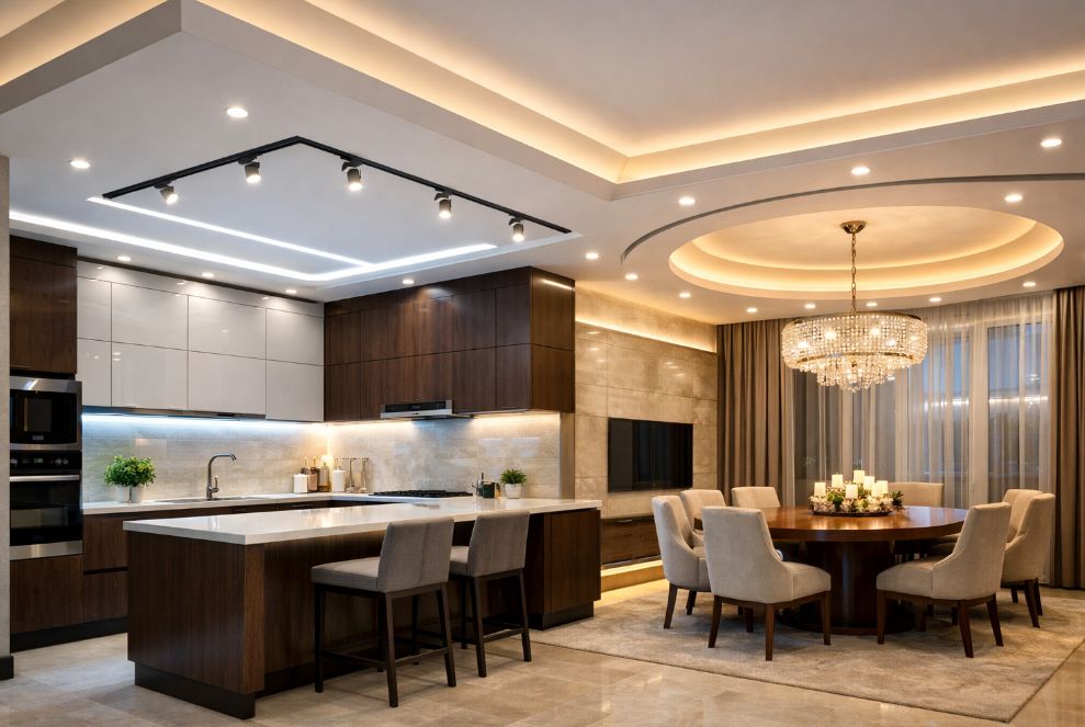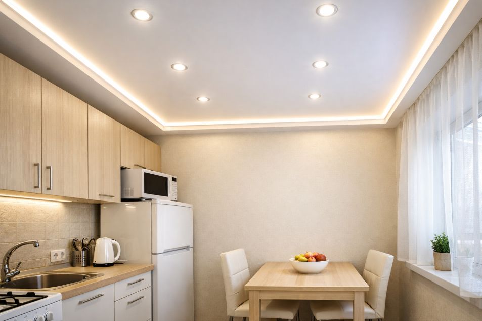 • Дизайн: используйте зонирование — понижение уровня потолка над рабочей зоной кухни или островом, выделение обеденной зоны отдельным ярусом с люстрой. Световые линии помогают создать чёткую геометрию и навигацию в пространстве.
