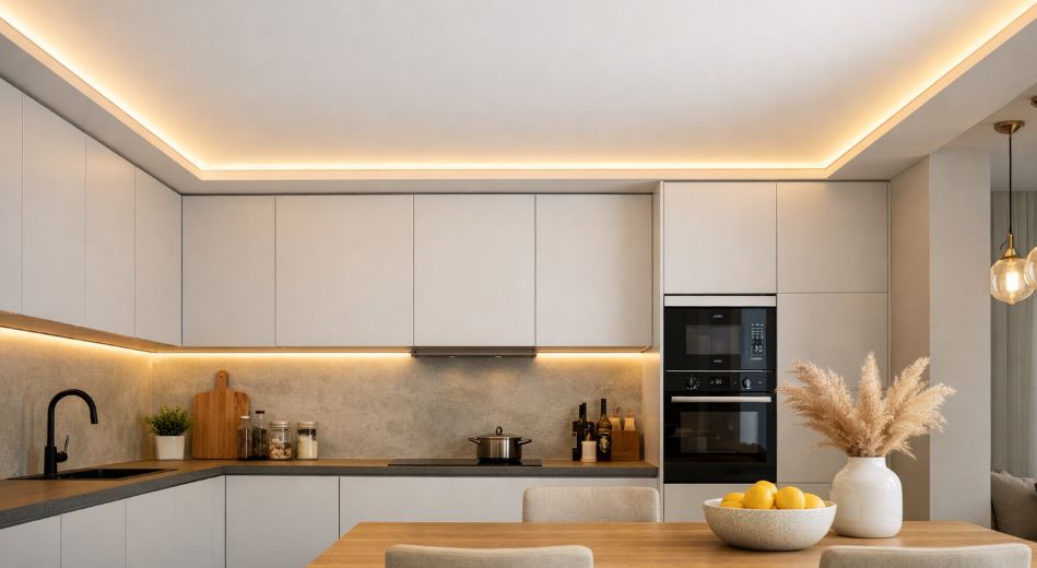 • Задачи на кухне: декоративное и основное освещение, зонирование, равномерное распределение света, подчёркивание геометрии помещения. Световые линии могут идти по периметру, вдоль рабочей зоны или создавать сложные геометрические узоры.