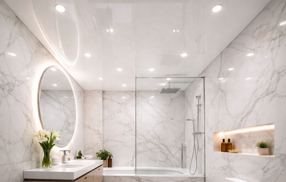 • Натяжной потолок из ПВХ (винилового полотна) — наиболее влагостойкий и герметичный вариант для ванной комнаты. Производители (Bauf, HALEAD или Teqtum) подтверждают, что качественные ПВХ-полотна выдерживают до 100 л/м² при затоплении сверху, защищая интерьер от повреждений. Монтаж натяжного потолка скрывает все коммуникации, трубы и вентиляционные каналы за ровной поверхностью. Однако установка требует использования тепловой пушки для прогрева помещения до 40–60 °C и привлечения профессиональной бригады. Это лучший вид потолка для защиты от протечек, подходит для любых санузлов.