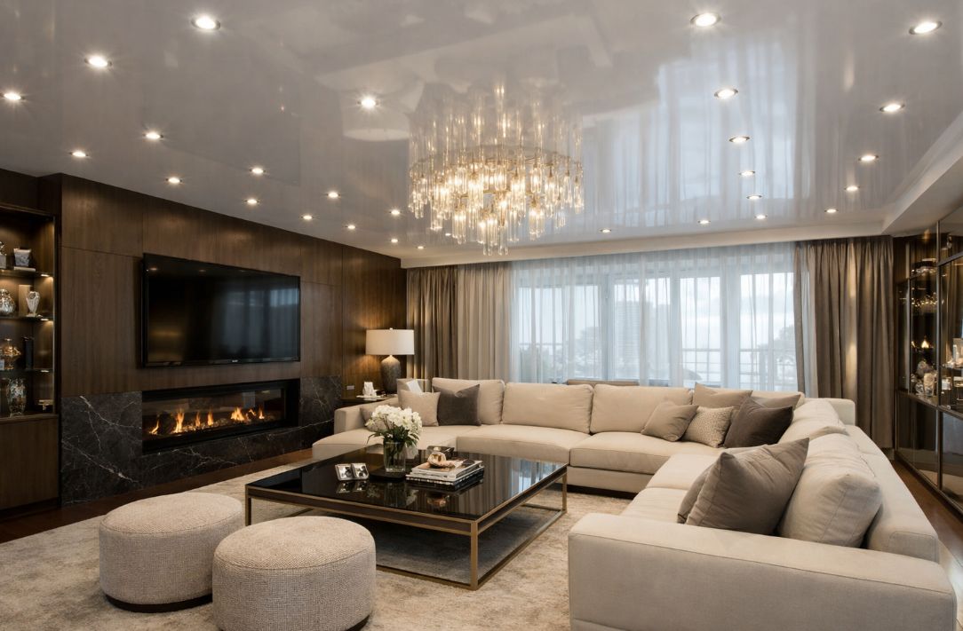 • Подвесные — для высоких потолков и зонального света (люстра над столом), минимум 400 мм от полотна, чтобы исключить нагрев.