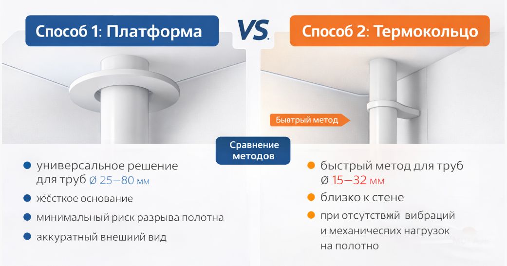 • Способ 1: Обводная платформа — универсальное решение для труб диаметром от 25 до 80 мм, расположенных в теле потолка. Обеспечивает жёсткое основание, минимальный риск разрыва полотна и аккуратный внешний вид.