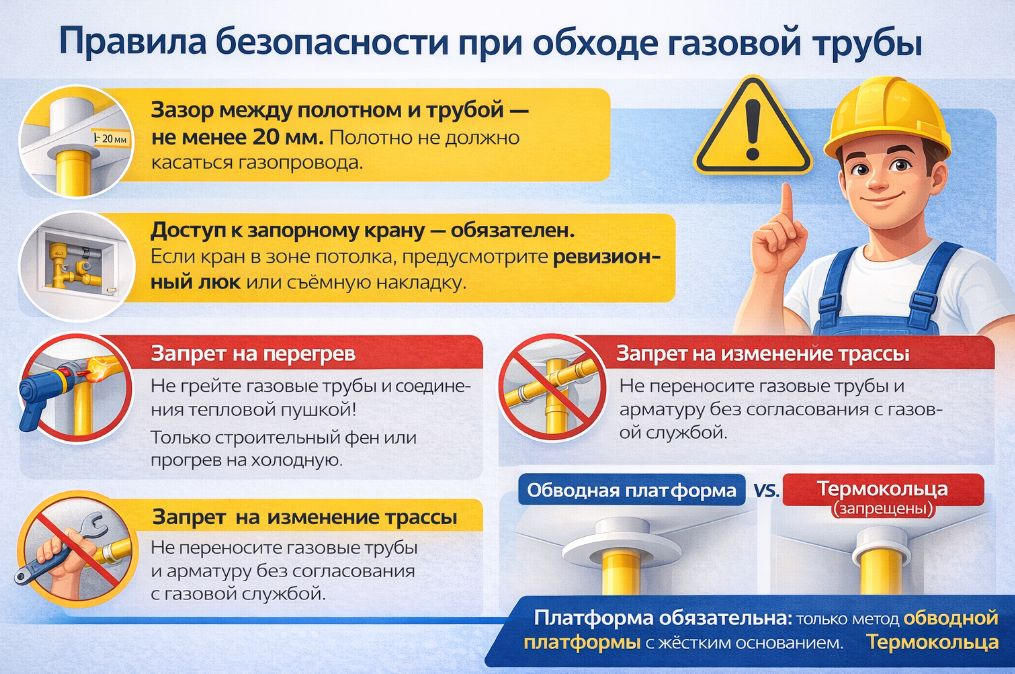 Нет. Газовые трубы требуют больших зазоров (не менее 20 мм между полотном и трубой), обязательного доступа к запорному крану и строгих ограничений по нагреву (запрет на использование тепловых пушек в радиусе 1,5 м). Для труб отопления — стандартная платформа или термокольца (для Ø 15–32 мм без нагрузок) без специальных требований к зазору. Газовые трубы — только платформа, без термоколец.