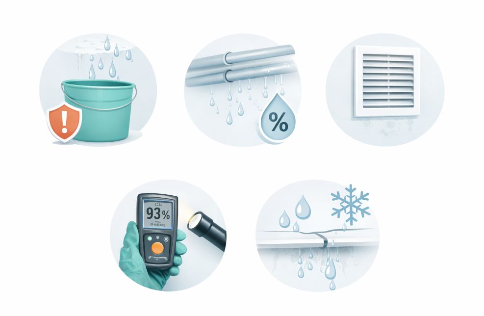 Наиболее частая комбинация — конденсат из-за «мостика холода» плюс слабая вытяжка в ванной. Устранение одной причины без другой даёт временный эффект.